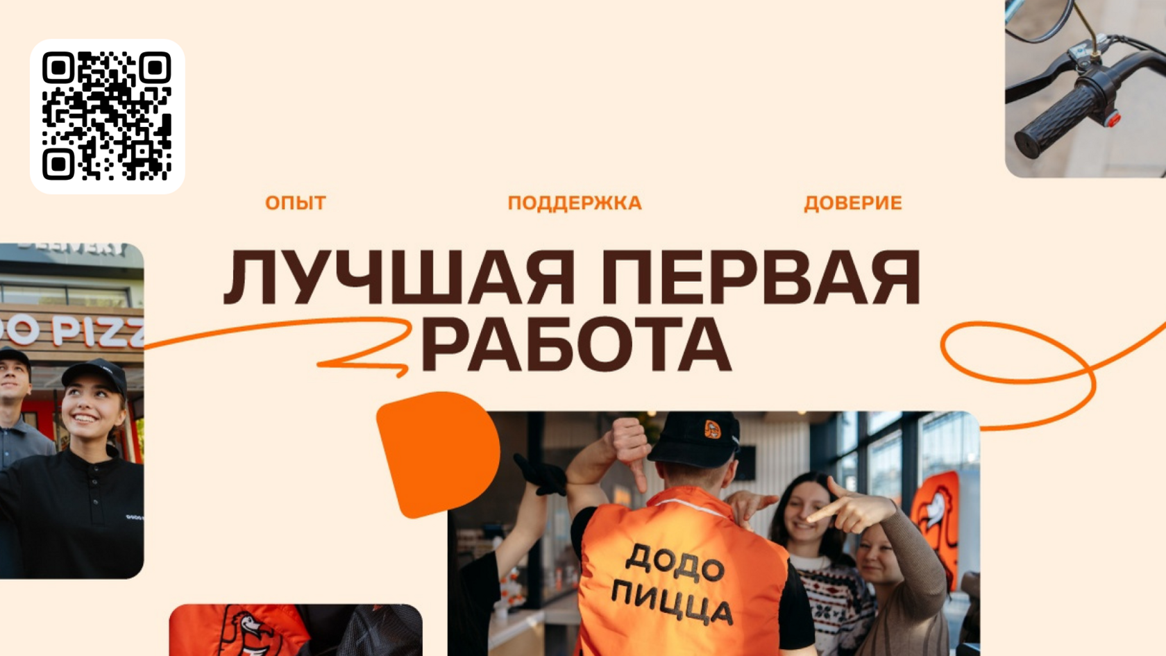 QR-код вёл не просто на форму отклика, а на HR-сайт «Додо Пиццы», который сам по себе стал элементом бренда. На сайте можно было не только заполнить анкету, но и: