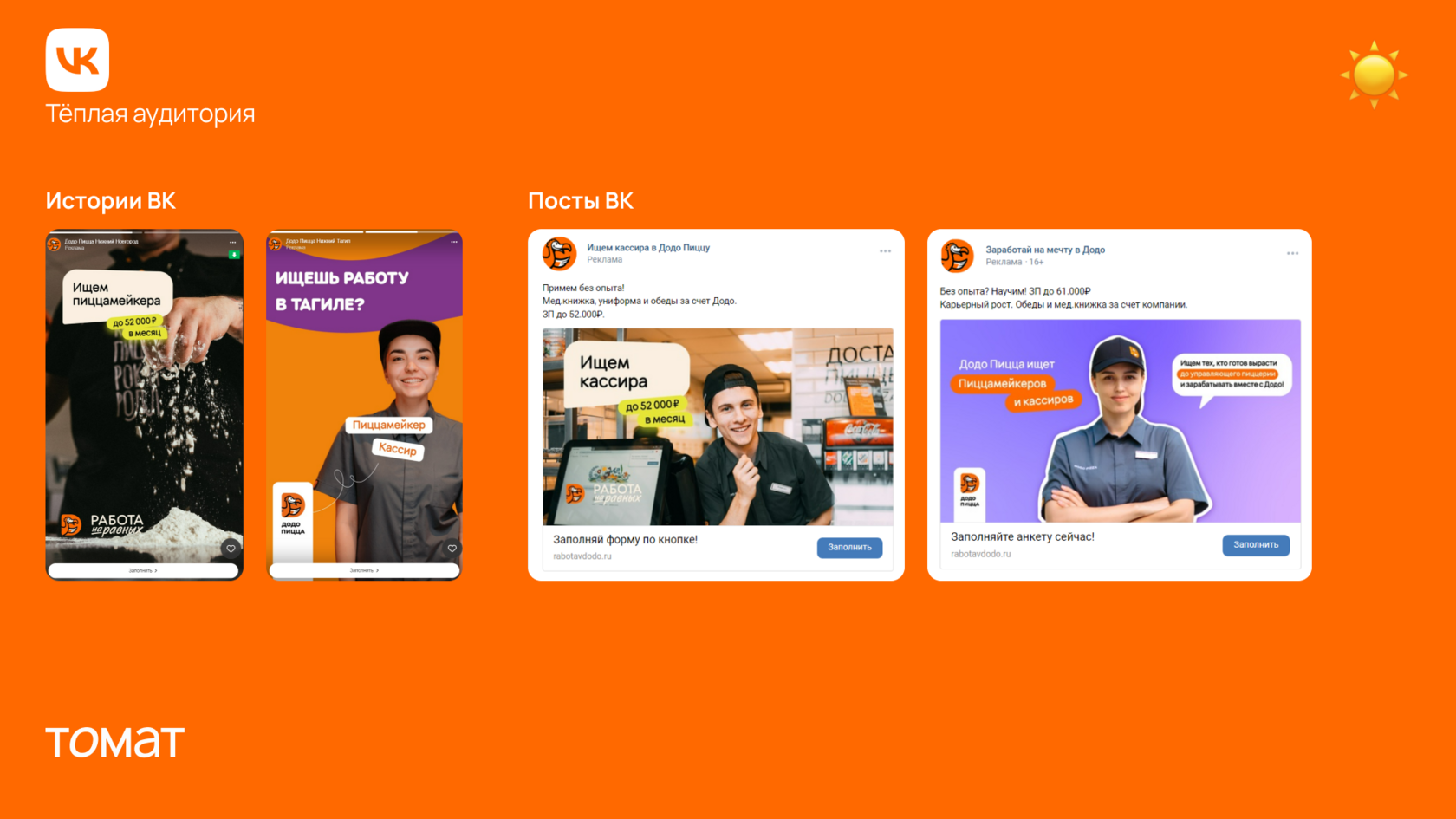 После работы с «горячей» аудиторией в Яндексе следующим важным направлением стало взаимодействие с «тёплой» аудиторией во ВКонтакте. Там мы используем таргетированную рекламу в историях и в ленте новостей. Эта аудитория не ищет работу активно (не вводит запросы вроде «ищу работу»), но при этом остается лояльной, вовлеченной и потенциально заинтересованной.