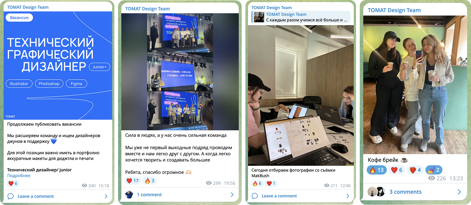 Telegram-канал стал для нас не только витриной, но и способом выстраивать доверие. Мы рассказываем о рабочих моментах, делимся личными историями, не боимся показывать закулисье. Главное — постоянство и искренность. Даже короткие заметки помогают поддерживать интерес к жизни команды и формировать позитивное восприятие бренда работодателя.