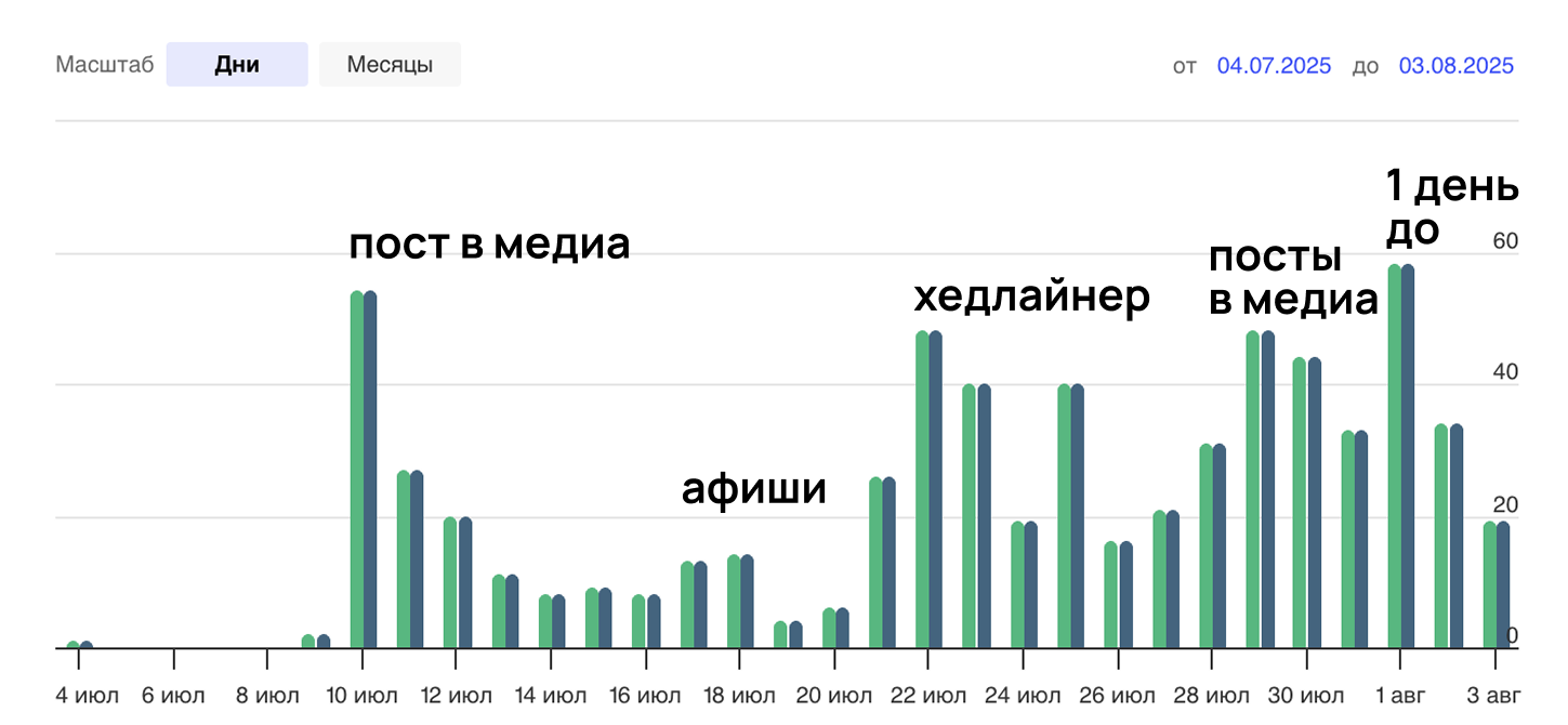 В итоге мы решили, что за три дня до офлайн-мероприятия нужно усиливать промо, чтобы достичь конверсии посещений около 50%.